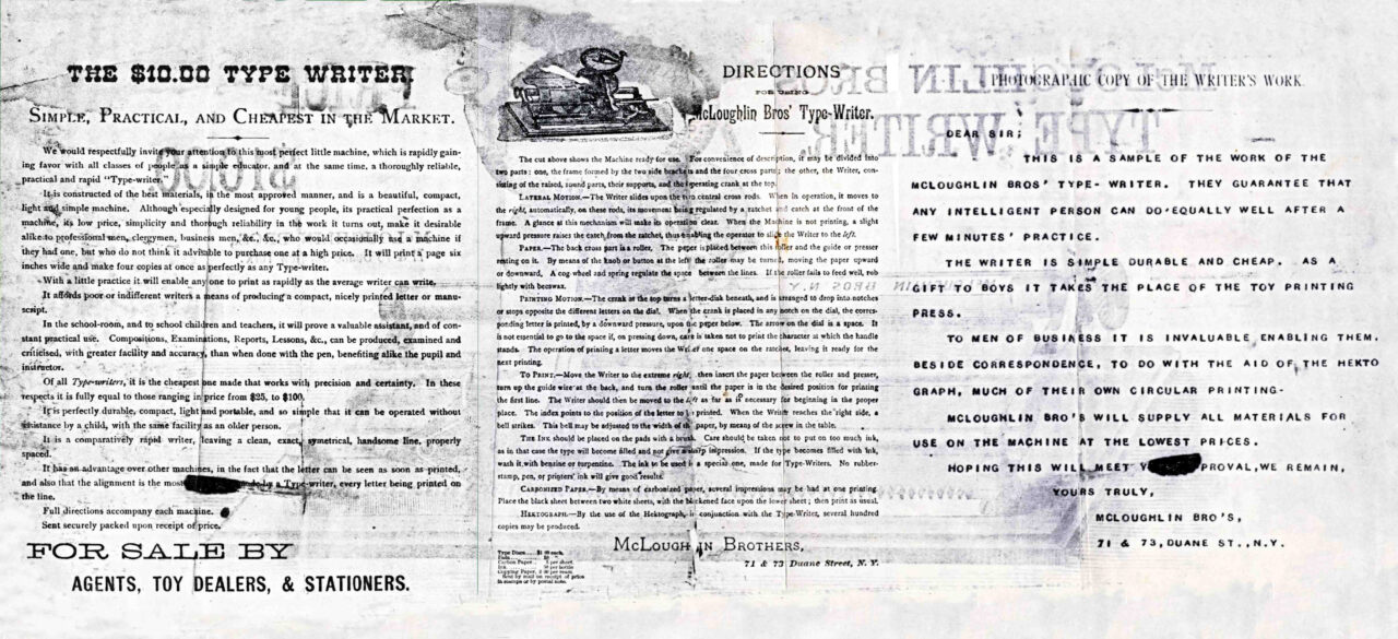 the $ 10.00 type writer | instruction leaflet, 1885 | mcloughlin bro’s typewriter