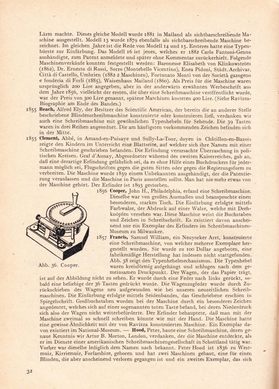 [..] 1856 Cooper, John H., Philadelphia, invented a typewriter. It was of large dimensions and required a special, strong table. The inking was done using an ink roller, the impression was made on a roller which was equipped with rotary…