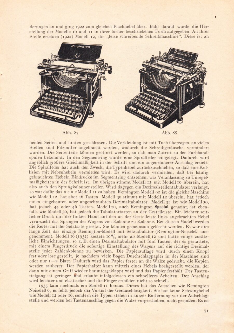 [..] Soon afterwards, production of the Models 10 and 11 in their until then described form was given up. In its place appeared (1922) Model 12, the ‘quiet writing typewriter’. It is closed on both sides and on the back. The…